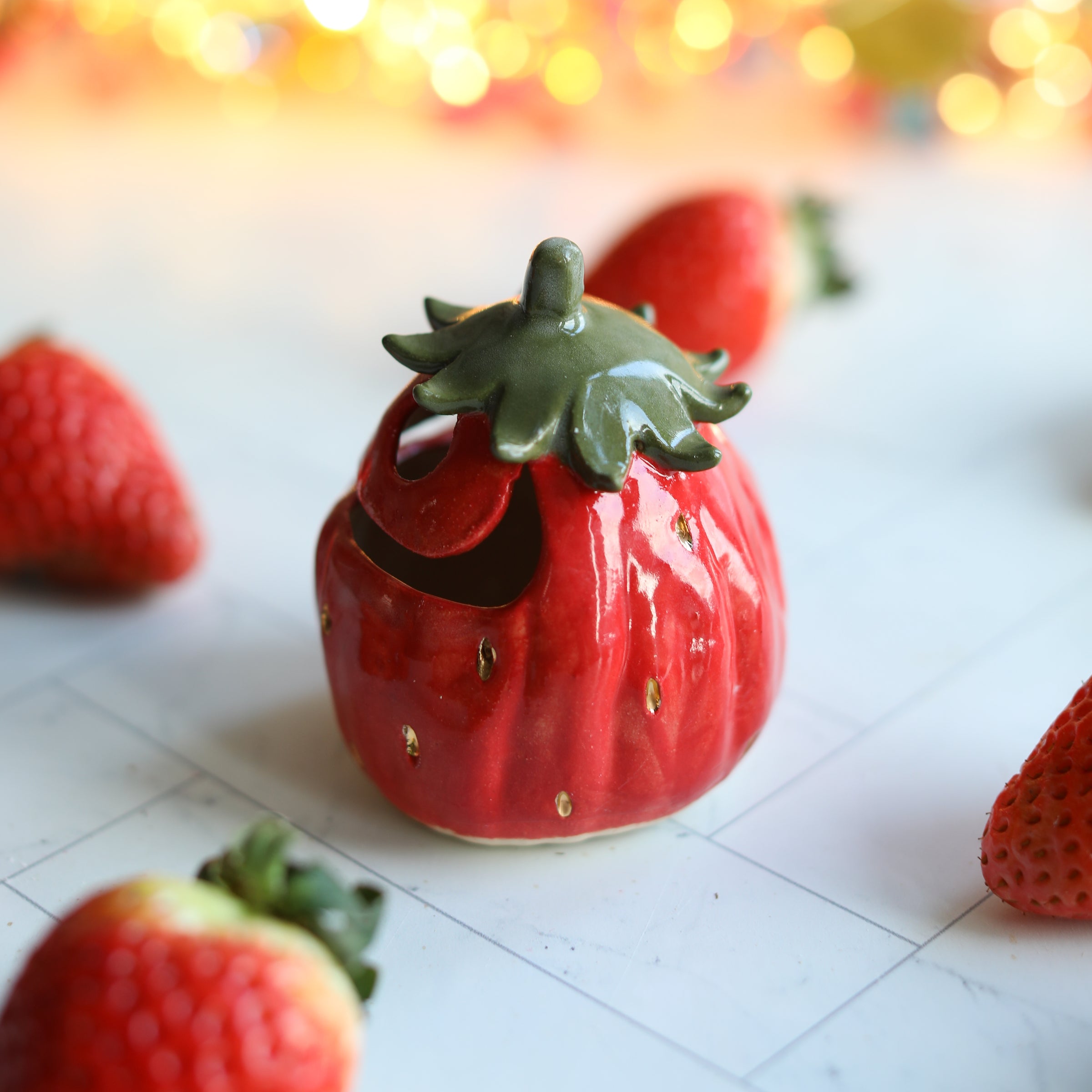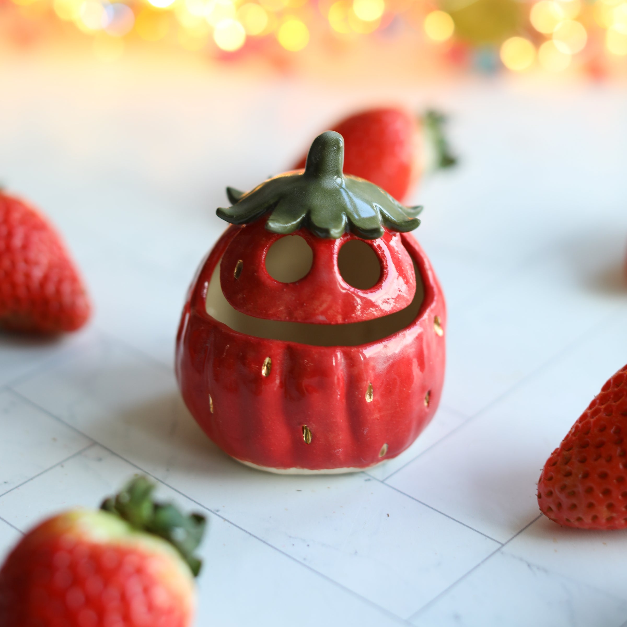 Gil-berry has a beautifully hand-painted bright red body, complete with real gold pips and a striking green leafy hat to protect him from the springtime sunshine. As always, Gil-berry is hollow, the perfect size in which to place a tealight candle to glow from the hand-carved eyes and wide Gilbert grin.