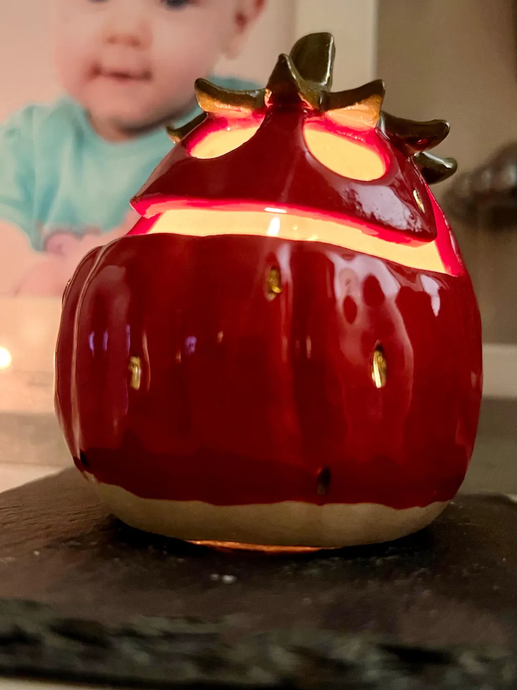 Gil-berry has a beautifully hand-painted bright red body, complete with real gold pips and a striking green leafy hat to protect him from the springtime sunshine. As always, Gil-berry is hollow, the perfect size in which to place a tealight candle to glow from the hand-carved eyes and wide Gilbert grin.